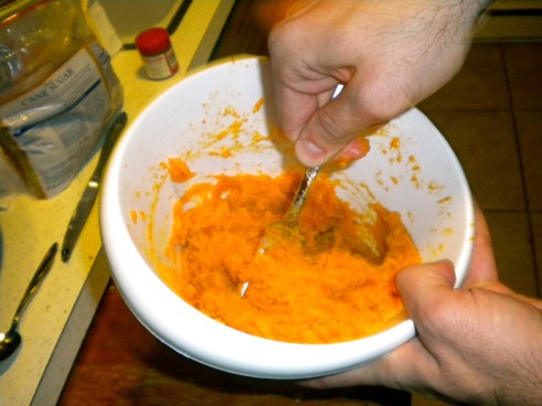 3. Mash sweet potatoes in a bowl. Add 3 Tbsp butter and 3 Tbsp of brown sugar. Mix.